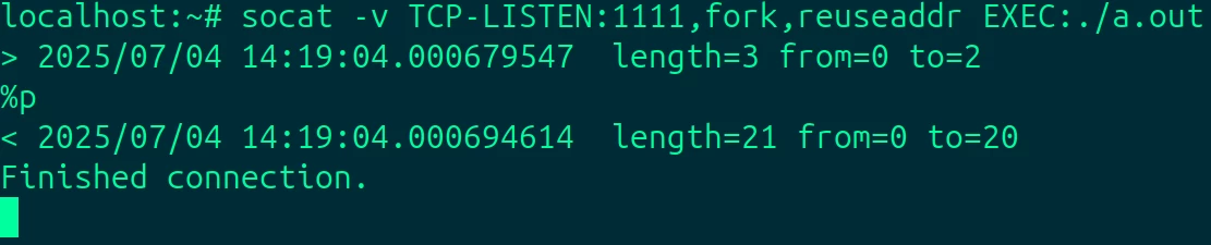 GUEST:~# socat TCP-LISTEN:1111,fork,reuseaddr EXEC:./a.out
