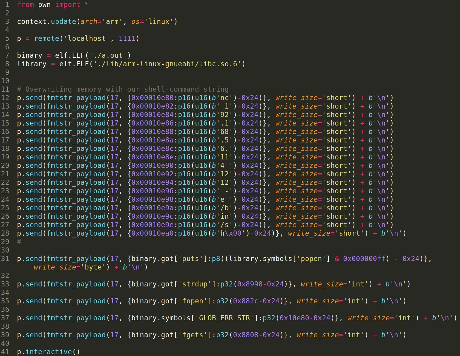 Using these features together with a specially crafted payload, format string equips us with an essential exploitation primitive of write-what-where. This means that we are able to overwrite content at arbitrary locations in the process memory with values we control.