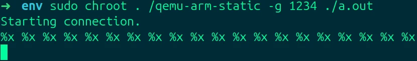 Having the target compiled, we may go ahead and start debugging; we run the sample with qemu-arm-static and provide the -g argument to attach a gdbserver to the process.