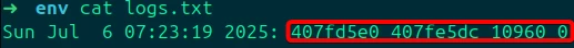When inspecting the content of the log file with observations of the stack contents on our connected remote pwndbg we can see that our format-string associates stack content further down.