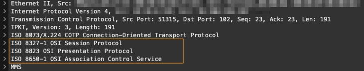 The higher layers (Session, Presentation, and Application) of the OSI Model, remained as is and delivered on top of TPKT data unit. Although those layers are not part of the MMS protocol, most MMS servers that we have observed implement the OSI layers along with MMS (probably to minimize the changes during the adaptation). This is why when MMS traffic is captured we will see the layer 5-7 below the MMS application data: