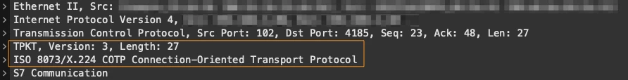 Lets see what it looks like in Wireshark for the S7Comm protocol, a proprietary Siemens protocol that operates on top of COTP):