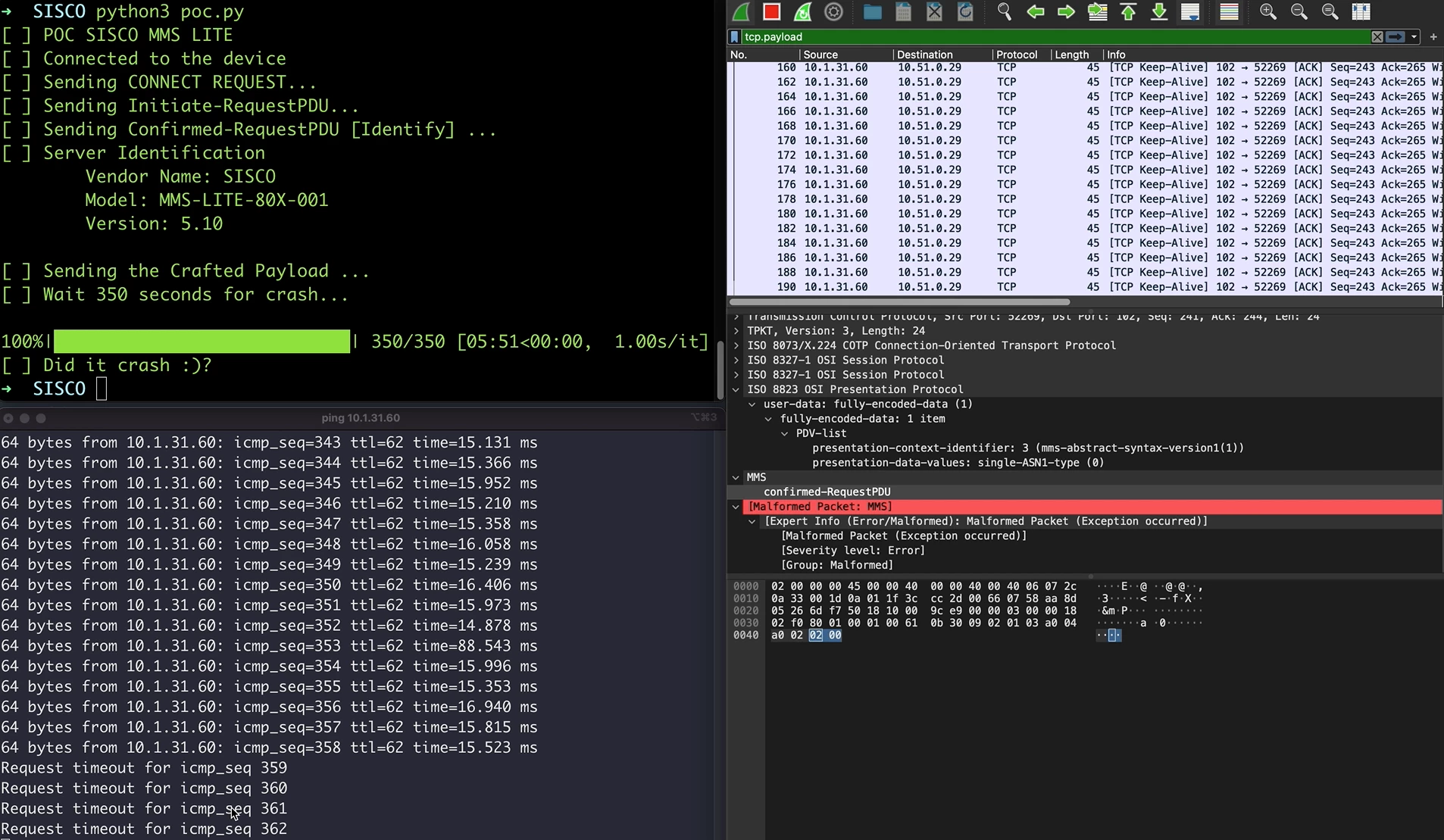 Fortunately we do not need to go very far. In our lab we have a pretty extensive number of controllers, some of them implement MMS protocol. We sent the generated payloads to all devices in our lab that support MMS and guess what? We have crashed some.