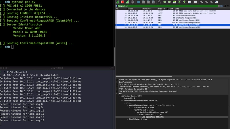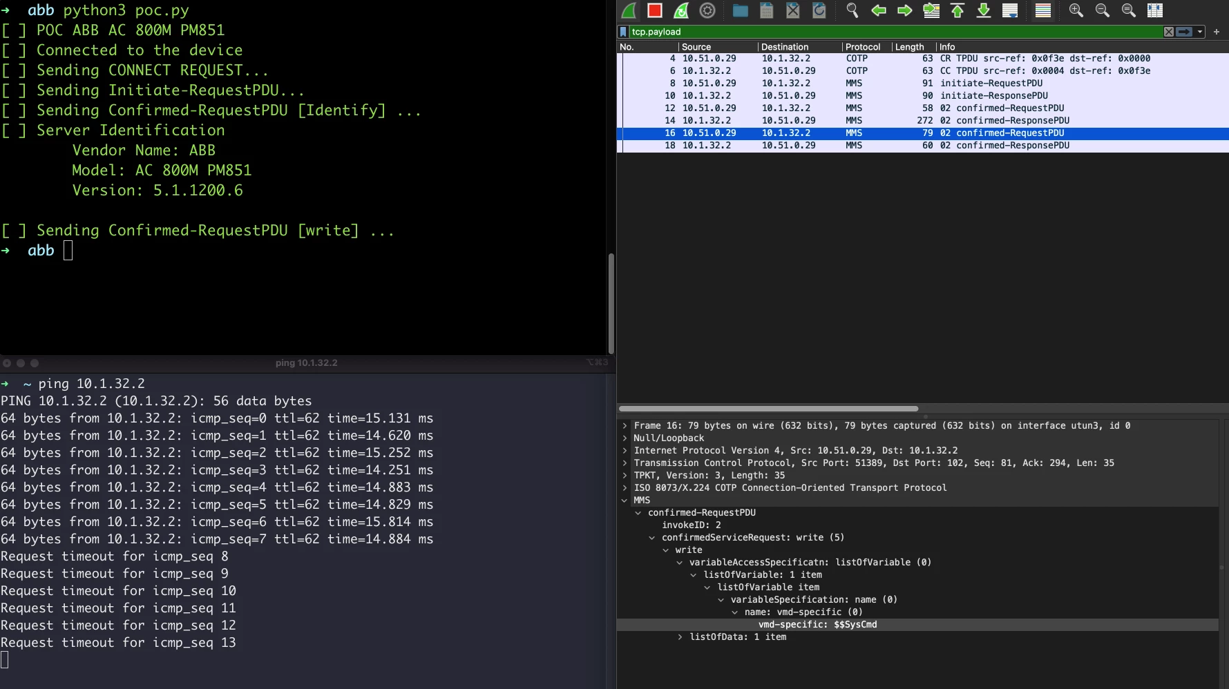 During the procedure of sending the corpuses that were generated by the fuzzers towards devices in our lab, we have encountered a peculiar case. A general purpose controller by ABB - ABB AC 800M - was “crashed” with following payload: