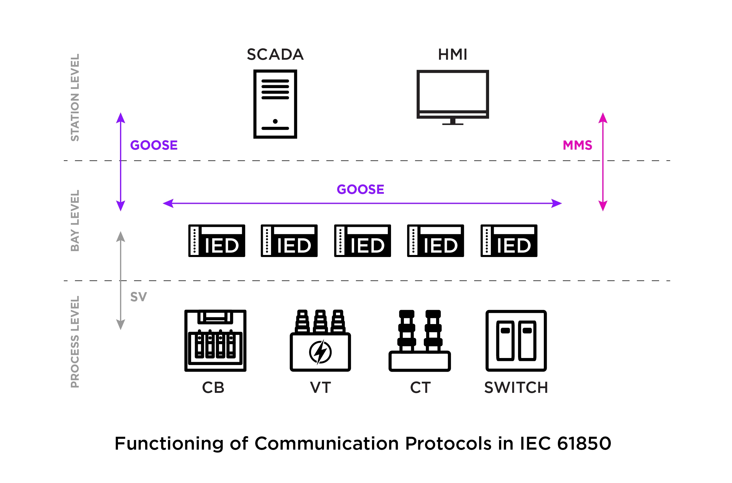 • GOOSE (Generic Object Oriented System Event): Used between IEDs to exchange information about specific substations controlled by the IED.